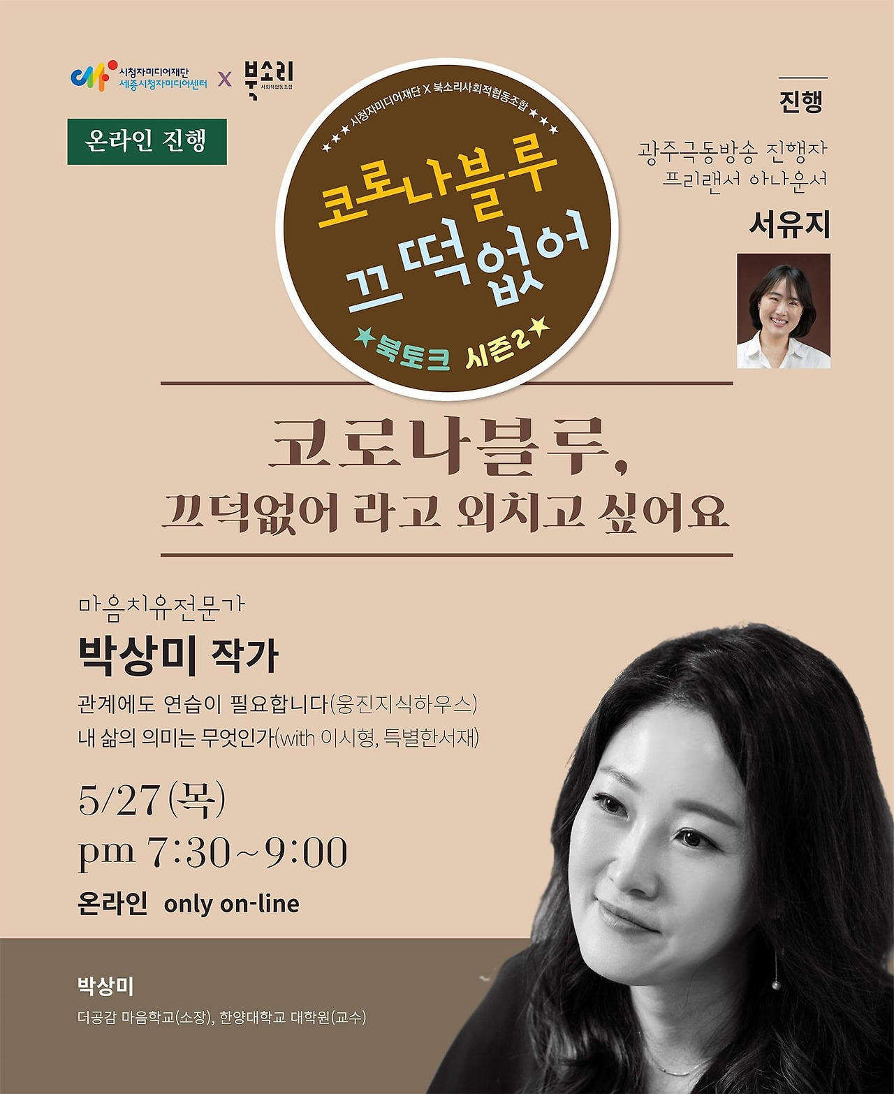 그동안 박상미TV를 통하여 간접적 소통을 해 오신 분들, 이번 기회에 줌으로 온라인 쌍방향 소통을 할 수 있는 절호의 기회입니다. 광클릭 한 번으로, 박상미 선생님과 서로 마음을 나눠보는 것 추천합니다. 진행은 광주극동방송의 진행자인 서유지님이 합니다. 북토크의 진행자로서의 면모를 유감없이 발휘하고 역시 상담학을 공부한 전문가라 아마 두 사람의 케미가 환상일 것이라 기대합니다.
