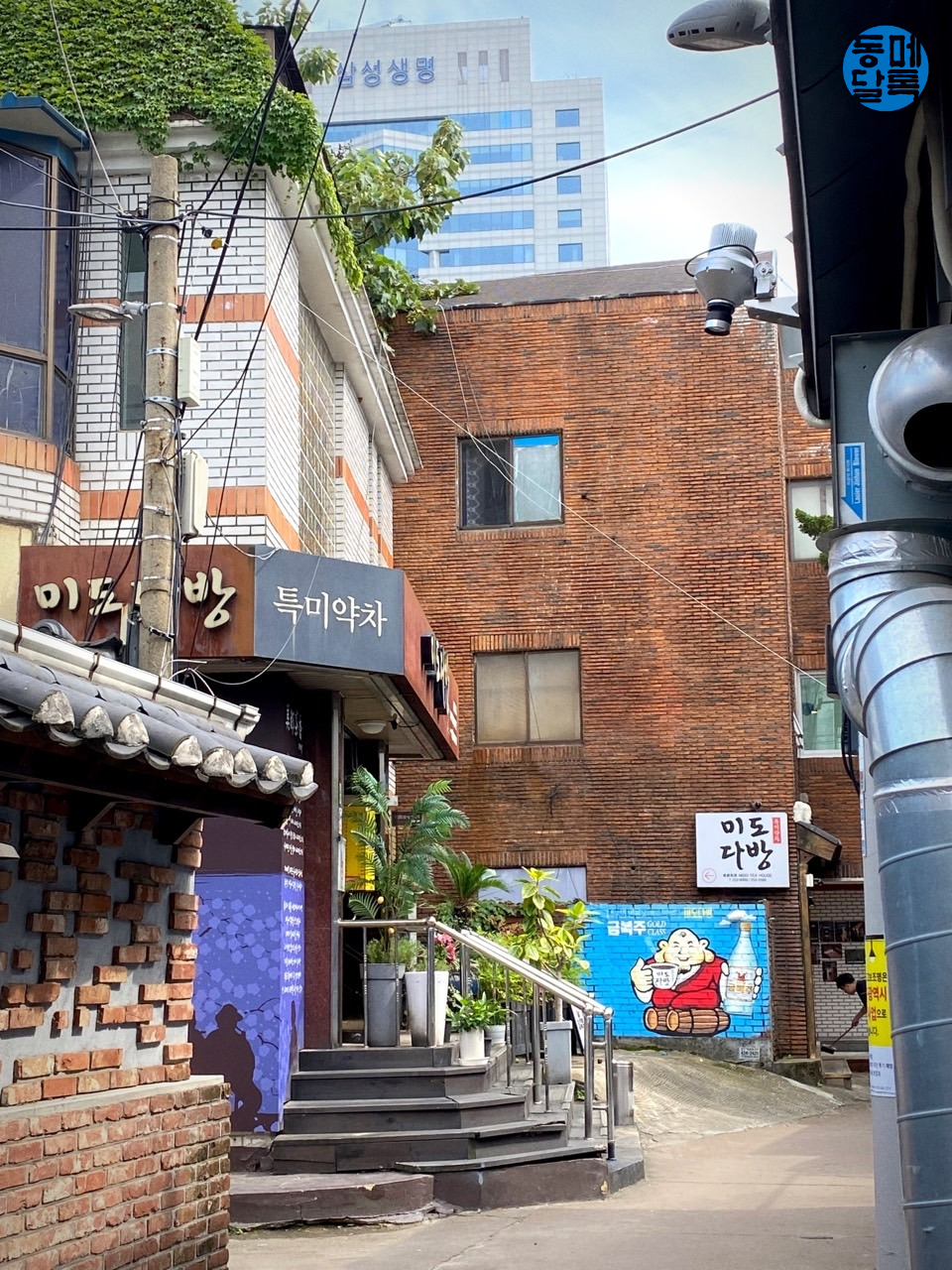 어른 되어 미도다방을 세 번 가 봤다. 처음에는 도시재생이라는 주제를 가지고 소위 지역 어른들 모시고 우르르 갔다. 두 번째는 또 오래된 다방에 대한 향수를 느껴보자는 구체적인 목적을 가지고 또 갔다. 소위 빈티지 카페 투어. 세 번째는 친구에게 가 보자고 꼬셔서 갔다. 그 세 번째가 일본 친구와 온 곳이다. 결국 세 번째 방문만 수다 떨러 갔고 나머지 두 번은 뭔가 옛 것의 향수나 도시재생 속에서 살아남은 무엇을 억지로, 굳이 느끼기 위하여 간 셈이다. 일하러 간 것이지. 처음과 두 번째, 그리고 세 번째까지 오래된 공간에 대한 감성을 느끼겠다는 우격다짐의 목적이 있었다치자. 그러나 공간보다 더 크게 와닿는 것은 사람이었다. 한복 입은 주인장의 품는 아우라가 사실 대단했다.
