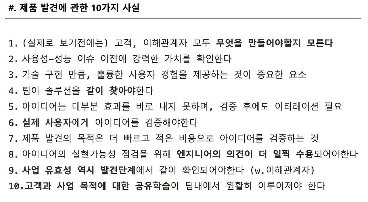 마지막으로 아래 '제품 발견에 관한 10가지 사실'까지 읽어보면, 결국 노력을 들이기 전에 미리, 같이, 고객을 통해, 자주 검증을 하는 것이 중요하다는 내용이다.