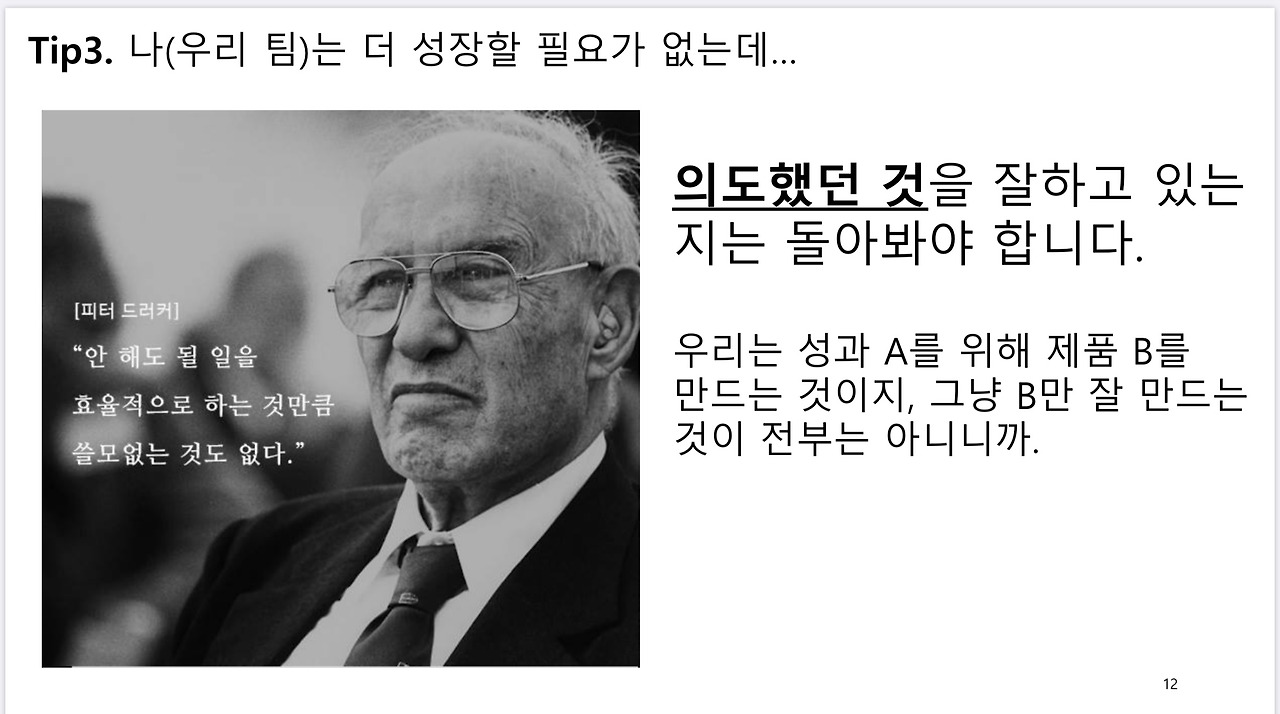 한 편, 잘하고 계시다면 ‘의도한 것에 맞게’ 잘하고 있는지 생각해봐야합니다. 아까 등장하셨던 피터 드러커 선생님이 하신 말씀 중에 ‘잘못된 일을 효율적으로 하는 것 만큼 쓸모없는 것도 없다’라는 말이 있습니다. 쓸모없다라고 하면 너무 가슴아프긴 한데, 우리는 비즈니스 하는 사람들이니까 50억 매출을 만들기 위해 제품 A를 만든다면 성과를 내야지 제품 A만 잘 만드는 것은 전부라고 할 수 없습니다. 실제로 우리가 잘 세우는 OKR에도 ‘제품 런칭’을 key result로 넣지 않는 것이 원칙입니다. ‘제품 런칭을 통해 00%달성’과 같이 측정될 수 있는 성과가 목표가 되어야합니다. 그래서 우리가 ‘의도한 것에 맞게’ 잘 하고 있는지는 한 번 돌아보실 필요가 있습니다.