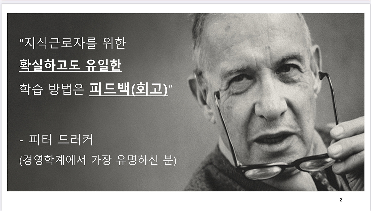 회사다니면서 “이 회사는 내 성장에 전혀 관심이 없어”라는 말을 많이 듣습니다. 스타트업이라 그런 것 같습니다. 대기업이면 사수도 붙여주고, 3개월 연수도 시켜주고 할텐데 여기는 조직도 자주 바뀌고 외부 환경도 자주 바뀌고 바로 성과를 내야하고 .. 맘 놓고 성장하기 어려운 환경인 것은 맞습니다. 다만, 이런 환경에서도 성장하고자 하는 욕구가 있으신 분께는 회고가 가장 좋은 방법인 것은 틀림없습니다. 여기 써있는 말은 제가 한 것은 아니고, 피터 드러커라는 세계적인 CEO들이 존경하는 경영학의 구루가 하신 말씀입니다. 강력하게 ‘유일한 성장 방법은 회고’라고 하시는데, 실제로 이 분은 초등학교 때 부터 회고를 하셨다고 합니다.