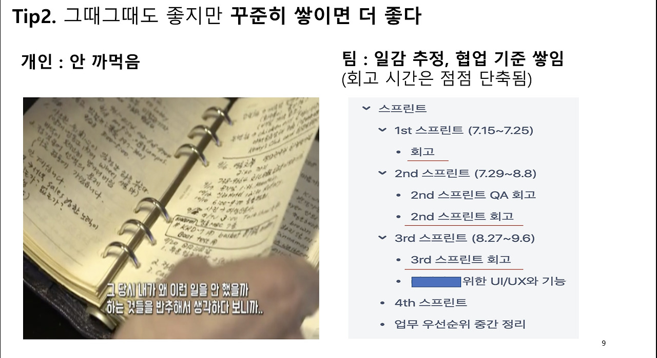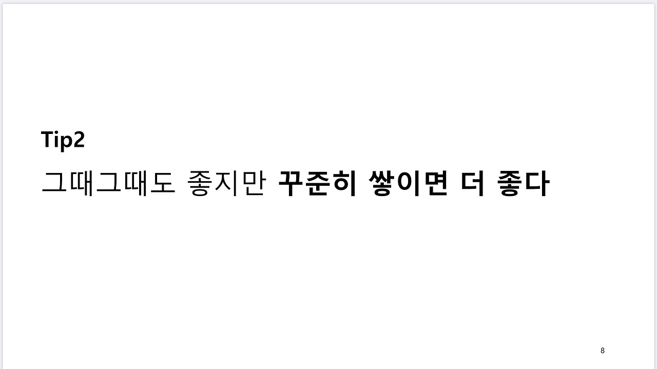 나머지 2개의 팁은 아주 짧습니다. 당연히 기록하고, 꾸준히 회고하면 더 좋습니다.
