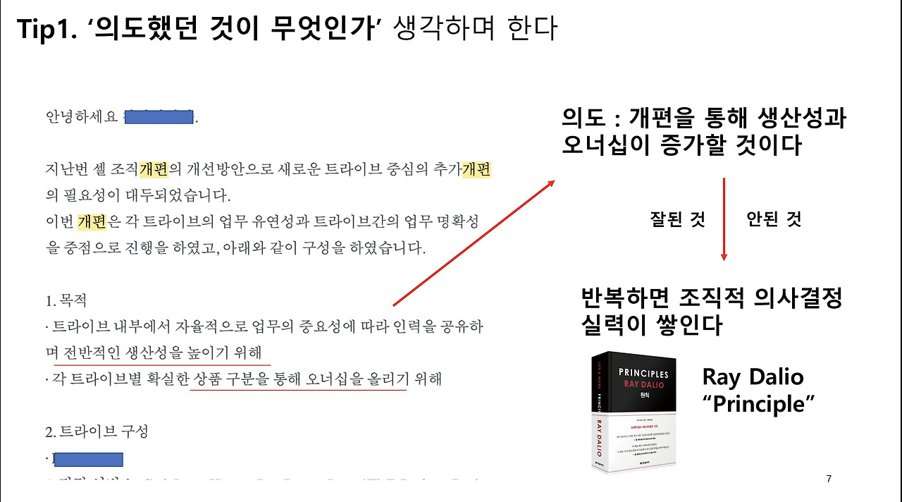 의사결정은 당연히 성공하기도하고 실패하기도할 수 있습니다. 다만 중요한 것은, 이 것을 회고하고 누적하면 ‘조직적 의사결정 실력’이 쌓인다는 것입니다. 제가 굳이 ‘조직적’이라고 표현한 것은, 반대로 이것을 하지 않으면 회사는 영원히 ‘그 때 당시에 재직 중인 가장 뛰어난 직원의 의사결정 수준’에 머물게 되기 때문입니다. 그 직원은 언젠가 이직할텐데, 그렇다면 그 회사는 몇 년이 지나도 비슷한 수준의 결정밖에 하지 못하게 됩니다. 이런 조직적 의사결정을 굉장히 잘하는 회사가 ‘브릿지워터’라는 미국의 헤지펀드 회사이고 CEO이신 레이달리오라는 분이 쓰신 ‘원칙’이라는 책이 좋아서 추천하려고 넣어두었습니다.