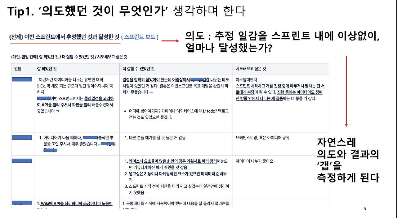 아까 나오셨던 피터 드러커 선생님은 항상 회고는 ‘의도했던 것과 결과의 차이를 측정해서, 그 갭을 메우기 위해 노력하는 과정’이라고 합니다. 그래서 회고 전에는 ‘우리가 의도했던게 무엇이었나’를 상기하면서 시작하는 것이 좋습니다.