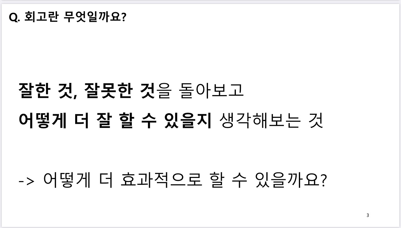 회고가 무엇인지 모르시는 분은 없을 것 같습니다. 잘한 것, 잘못한 것, 그래서 앞으로 더 잘하려면 어떻게 할까를 생각하는 것인데, 사실 하는게 어렵지 이것만 해도 절반은 먹고 들어간다고 생각합니다. 다만, 간단한 몇 가지만 더 챙기면 훨씬 효과적인 회고를 할 수 있어서 오늘 3가지 팁을 소개드리려고 합니다.