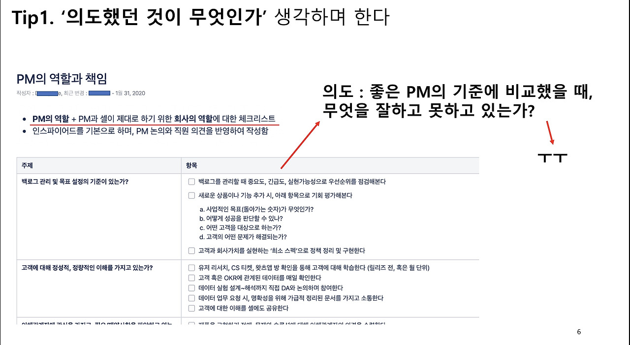 다른 예시인데, 저희 PM 그룹이 만든 PM의 역할과 책임에 관한 체크리스트 입니다. 회사에 PM직무가 생긴지 1년이 안되어서 작년에 저희가 ‘인스파이어드’라는 책을 읽으며 머리를 맞대고 기준을 만들었습니다. 저희는 매 월 이 체크리스트, 즉 저희가 의도한 PM의 모습을 보면서, 우리가 잘 하고 있는 것은 무엇이고 이대로 못하고 있는 것은 무엇인지 돌아보고 있습니다. 만약 이런 기준이 없다면 사람마다 잘하는 피엠의 기준이 달라 명확히 갭을 측정할 수 없습니다.