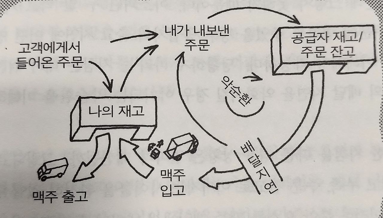 또 하나의 예시를 들어보자. 학습 조직을 읽지 않은 사람도 SCM(공급망관리)에 관심이 있다면, 아래 ‘맥주게임’의 사례는 들어보았을 수 있다.