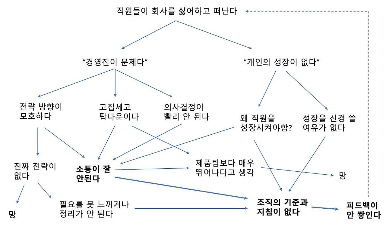 유능한 직원들이 성장을 위해 2~3년 근무하고 회사를 떠나는 것은 일반적이다. 하지만 일신의 사유가 아닌 회사의 무언가가 직원들을 떠나게 했다면, 이제 돌이켜 문제를 진단/해결해야할 시간이고(이미 늦었는지도 모르겠다) 이것이 앞으로 6개월동안 해보려는 일이다. 일단 문제를 먼저 좀 보자.