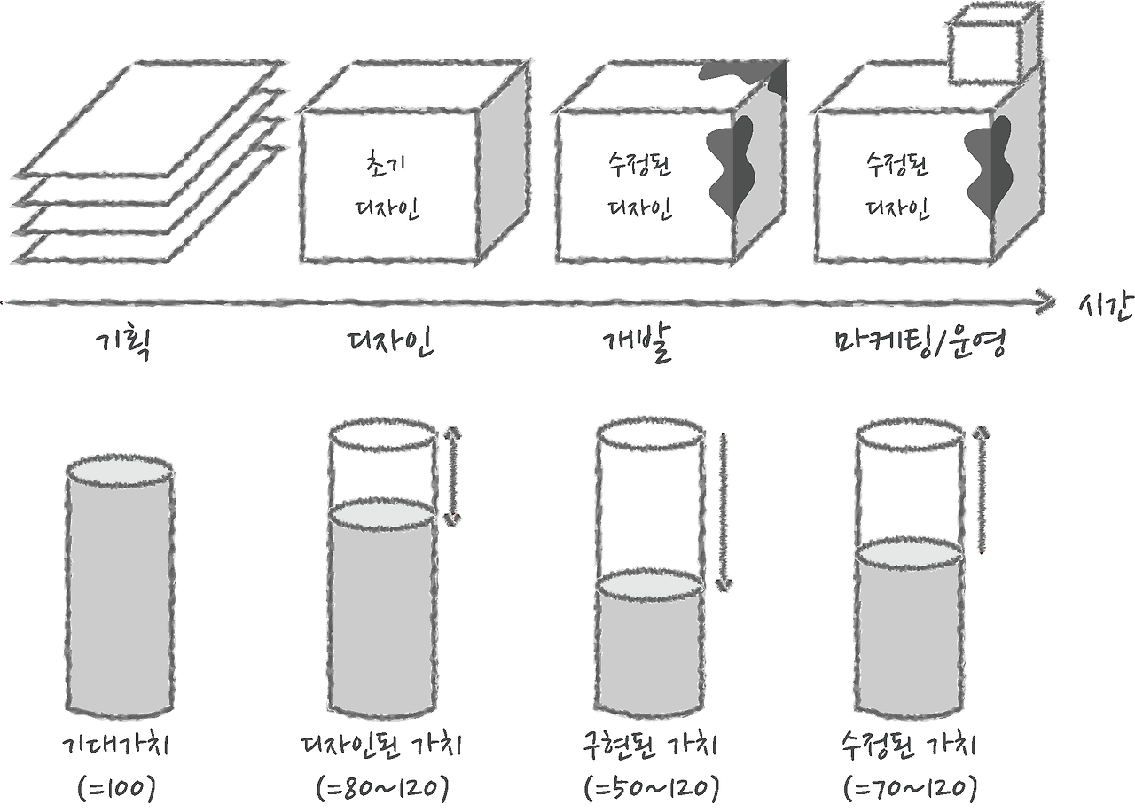 상품 개발 과정에서 기대 가치는 초기 디자인 단계에서 잠시 상승할 수 있지만, 개발이 진행될수록 대부분 감소하는 경향이 있다. 이는 조직 내 여러 역할자들이 각자의 목표를 위해 열심히 일하지만, 사용자에게 전달될 상품의 가치를 (유지하거나) 보호하는 역할이 없기 때문이다. 경영진과 리더들이 사용자 경험 관점에서 의사결정을 내리지 않는 것도 중요한 이유 중 하나다.