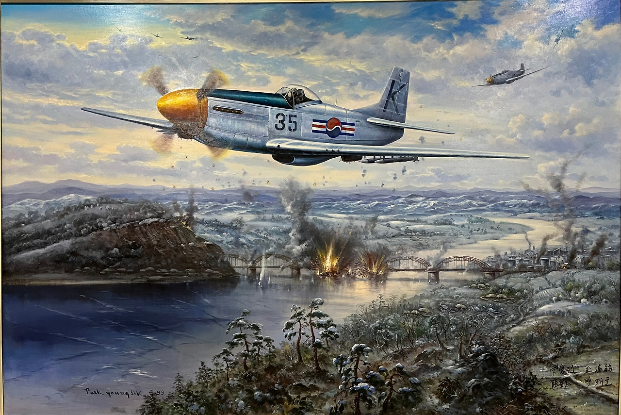 1952년 1월 15일 평양 동쪽의 승호리 철교를 폭파하는 장면. 당시 출격 조종사였던 윤응렬 공군 소장의 경험을 토대로 1999년 박영식 화가가 그린 그림. 전쟁기념관 소장.