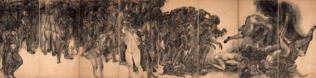 두 번째는 마루키이리 丸木位里와 마루키토시 丸木俊 라는 부부 이야기입니다. 이들은 히로시마 원폭을 주제로 그림을 그려 전 세계적으로 유명해진 화가였습니다. 남편인 마루키이리는 1901년 생으로 히로시마 출신이었습니다. 마루키이리는 원폭 당시 히로시마에 살고 있던 부모를 구조하기 위해 현장으로 갔었고, 부모를 발견한 다음 아내 마루키토시까지 불렀습니다. 그래서 부부는 원폭 참상을 생생하게 목격했습니다. (아내는 현장에 남아 있던 식재료로 음식을 해서 맛을 보았다가 방사능에 피폭되어 죽을 위기를 겪기도 했습니다.) 이전에 한 번도 볼 수 없었던 어마어마한 폐허와 그 속에 펼쳐진 잔혹하고 처참한 모습이 너무 충격적이었습니다. 그래서 그들은 그 장면들을 높이 1.8m, 너비 7.2m에 달하는 거대한 4폭 병풍화를 연작으로 그리기 시작했습니다. 전후 일본에는 반핵운동이 크게 일어났고, 덕분에 두 부부가 그린 작품들은 전국을 순회하며 전시가 될 정도로 유명해졌습니다. 미국에서 열린 전시회에 참가하기 전까지 부부가 그린 내용은 일본인 희생자들에 대한 것이었습니다. 미국 전시회에 패널로 참가했던 부인에게 캘리포니아 공과대학 한 교수가 부부가 그린 작품을 맹비난하기 전까지는 말입니다. 그 교수는 일본인들이 원폭피해를 강조해서 난징대학살 같은 끔찍한 전쟁범죄를 회피하고 희생자 코스프레를 하고 있다고 꼬집었습니다. 마루키 부부는 외국인들이 일본 반핵운동을 그러한 시각으로 보고 있다는 것에 큰 충격을 받았습니다. 그리고 그때부터 히로시마 원폭 한국인 희생자, 미군 포로 사망자, 아우슈비츠 등 다른 전쟁피해자들을 주제로 그림을 그리기 시작했습니다.