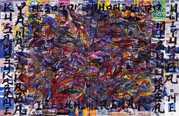 그림을 자세히 보면 중앙에 알아보기 힘든 물체들이 서로 뒤엉켜있습니다. 주로 푸른색과 붉은색으로 칠해져 있습니다. 중앙하단을 보면 눈과 주둥이가 그려져 있고, 그 뒤로 작은 지느러미 같이 생긴 것이 달려있는 것이 보입니다. 분명 물고기입니다. 주변으로는 알 수 없는 문자들로 가득 채워져 있습니다. 한자처럼 보이기도 하고 군데군데 알파벳이 보이는 듯합니다. 이런 형태인데 읽을 수 없는 문자는 범어 梵語(산스크리트어)일 텐데, 잘 모르겠습니다. 그리고 캔버스 가득 배경으로 채워져 있는 것은 가만히 보니 여행잡지들입니다. 클럽메드도 있고, 항공사에서 발행한 잡지도 있네요. 무슨 뜻인지, 그리고 이게 애튜섬 전투와 무슨 관계인지는 더더욱 모르겠습니다.