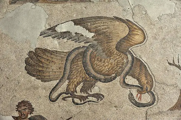 태양이 정오에 섰을 때 : 차라투스트라는 창공을 응시하였다. 머리 위 하늘에서 날카로운 소리가 들렸기 때문이다. 보라! 독수리가 대기를 헤치면서 커다란 원(Kreise)을 그리고 있으며, 그 목에는 뱀이, 잡힌 물건으로서가 아니라 다정한 벗으로서 고리처럼 감겨 있다.
