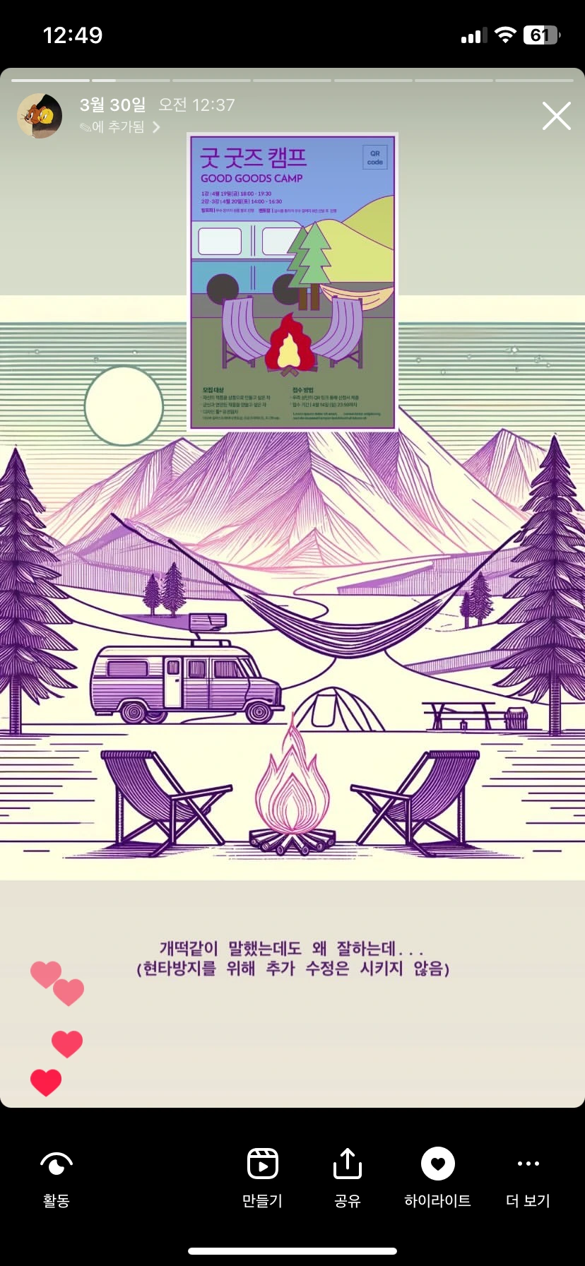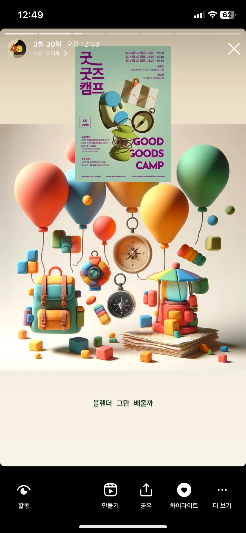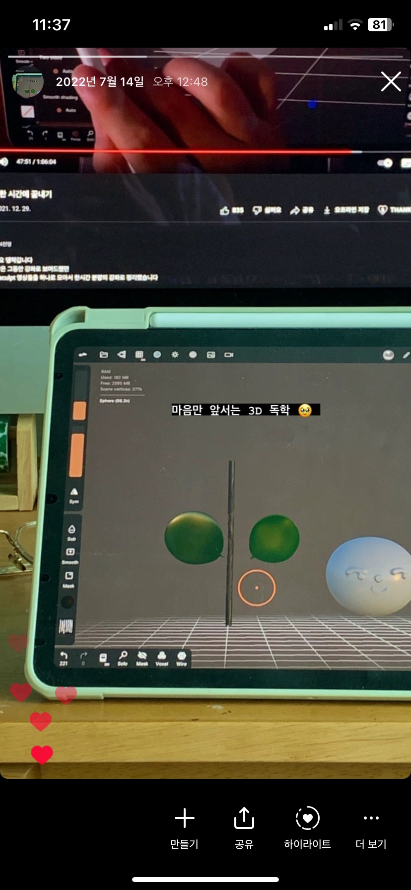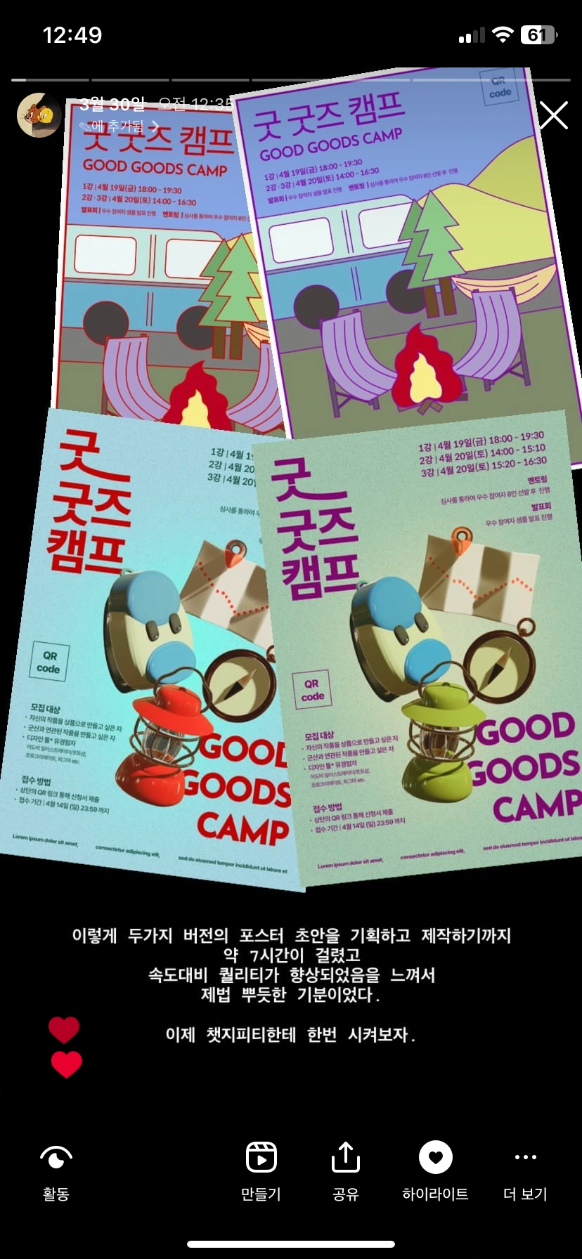 특히 브랜딩을 위한 디자인 업무는 회사를 나온 근 몇 년간 더욱 재미있었다. 전공자도 아니며 딱히 누군가에게 배운 적도 없고, 조직에서의 직무도 디자이너였던 적이 없다는 약점을 오히려 방패 삼아 부족한 결과물도 그냥 일단 인터넷 세상에 팍팍 내놓았다. 실력이 점점 좋아질 거라는 자신이 있었다. 실제로 2년 전에 3D 독학을 시작했다며 올린 인스타그램 스토리와, 가장 최근에 만든 3D 결과물을 나란히 놓고 보면 어느정도의 발전이 보인다.