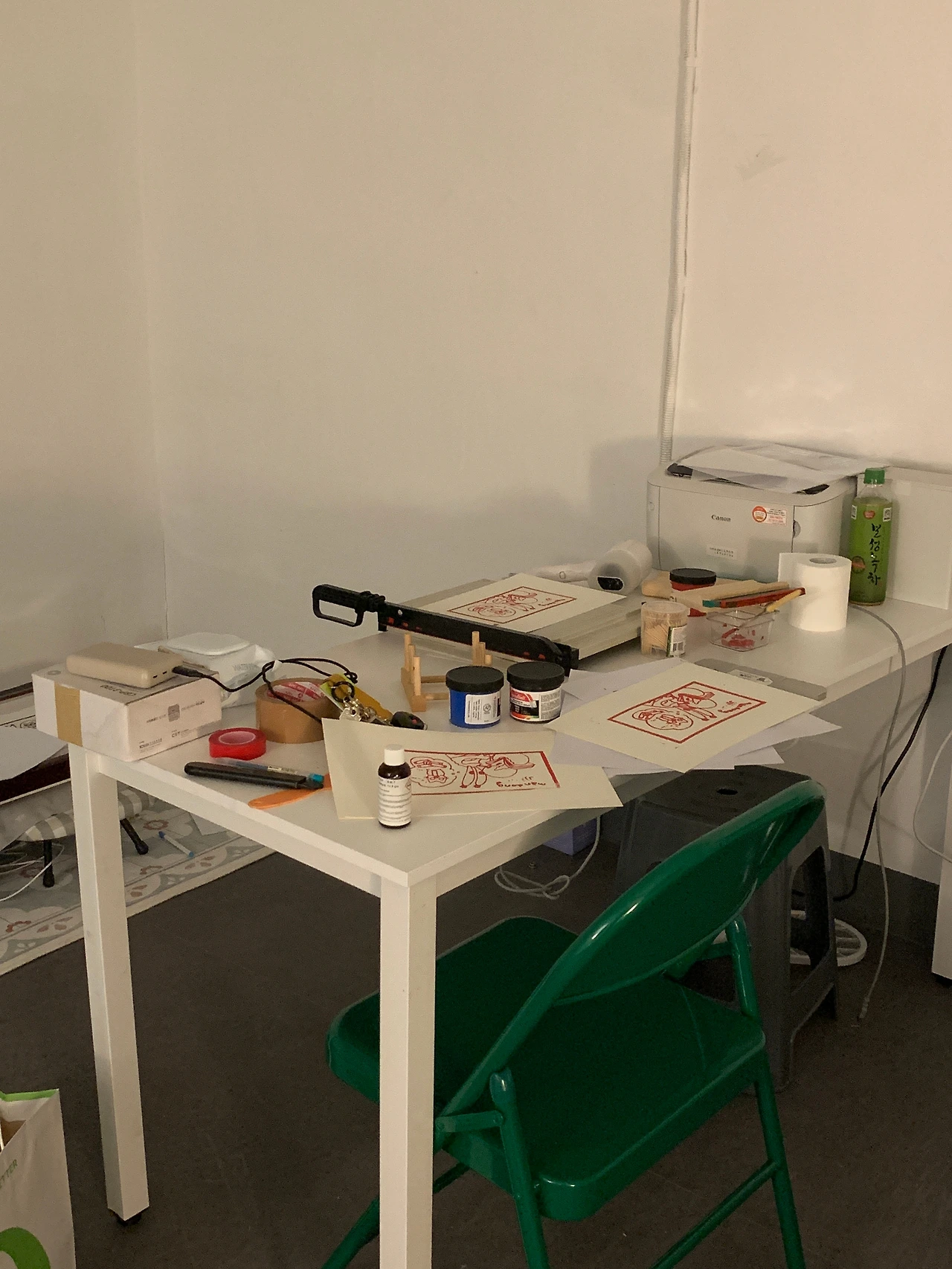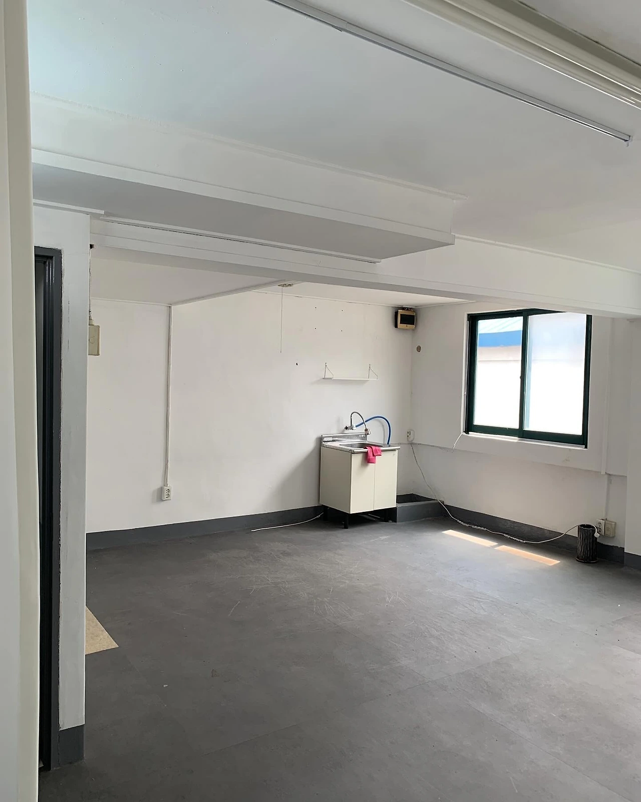 이곳은 인현시장을 빽빽하게 채우고 있는 상가건물들 중, 1층에 술집, 2층에는 이발소가 있는 3층짜리 건물의 3층 공간이다. 계약서를 작성하면서 얼핏 듣기로는 1,2층 모두 업력이 30년 가까이 되셨고, 3층은 주로 사무실로 쓰였댔다. 문을 들어서자마자 느낌이 왔다. 적당한 사이즈, 햇빛이 예쁘게 드는 큰 창, 실크스크린 작업에 꼭 필요한 수전! 심지어는 기대도 안했던 멀끔한 회색 시트지 바닥과 흰색 콘크리트 벽까지. 아, 여기다!
