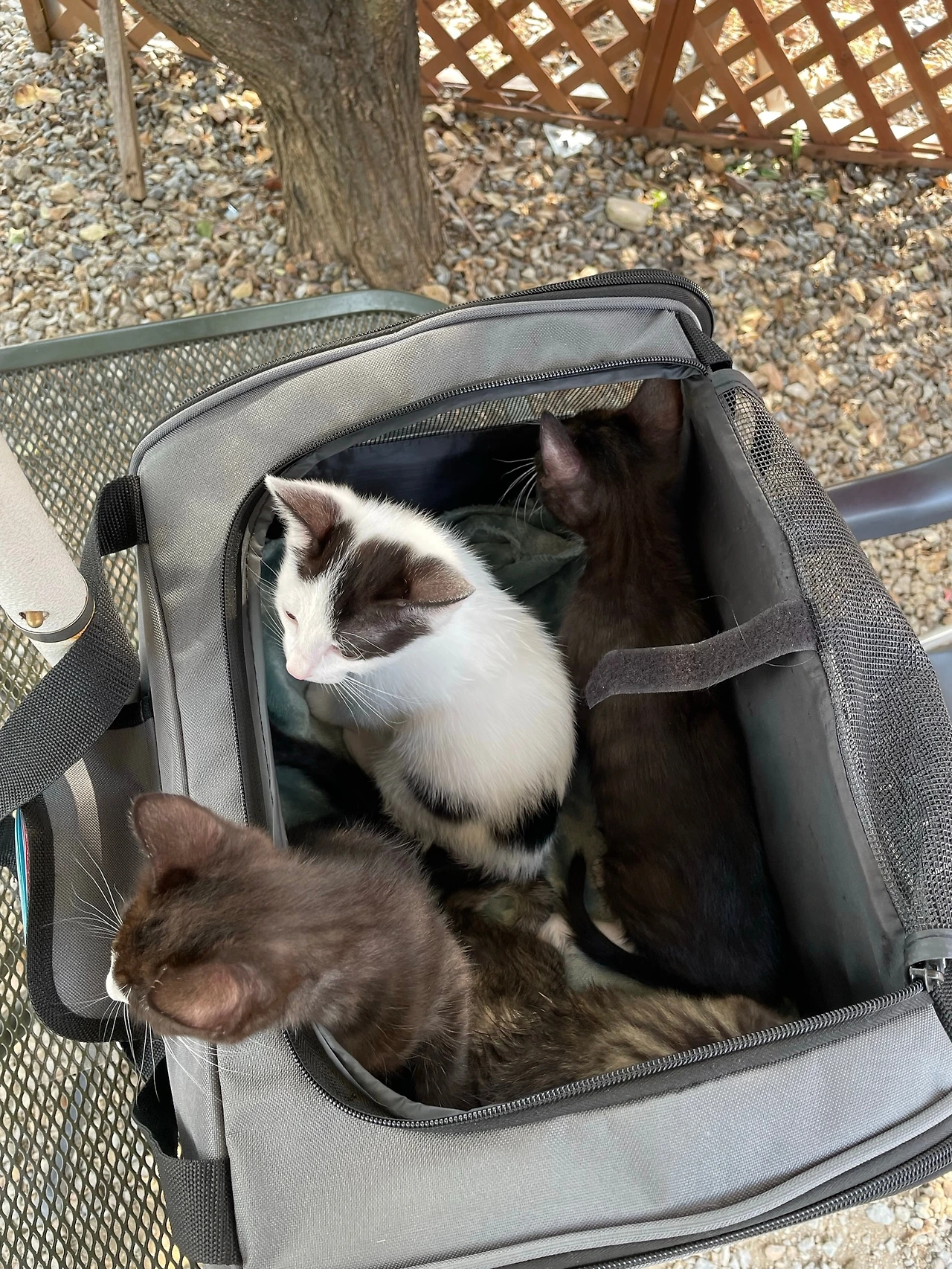 주말이 아니라 남편 없이 혼자서 네 마리를 다 데리고 가야 했다. 그나마 다행인 건 아직 가벼운 쪼꼬미들이라 하나의 이동장으로 모두 데리고 갈 수 있었다.