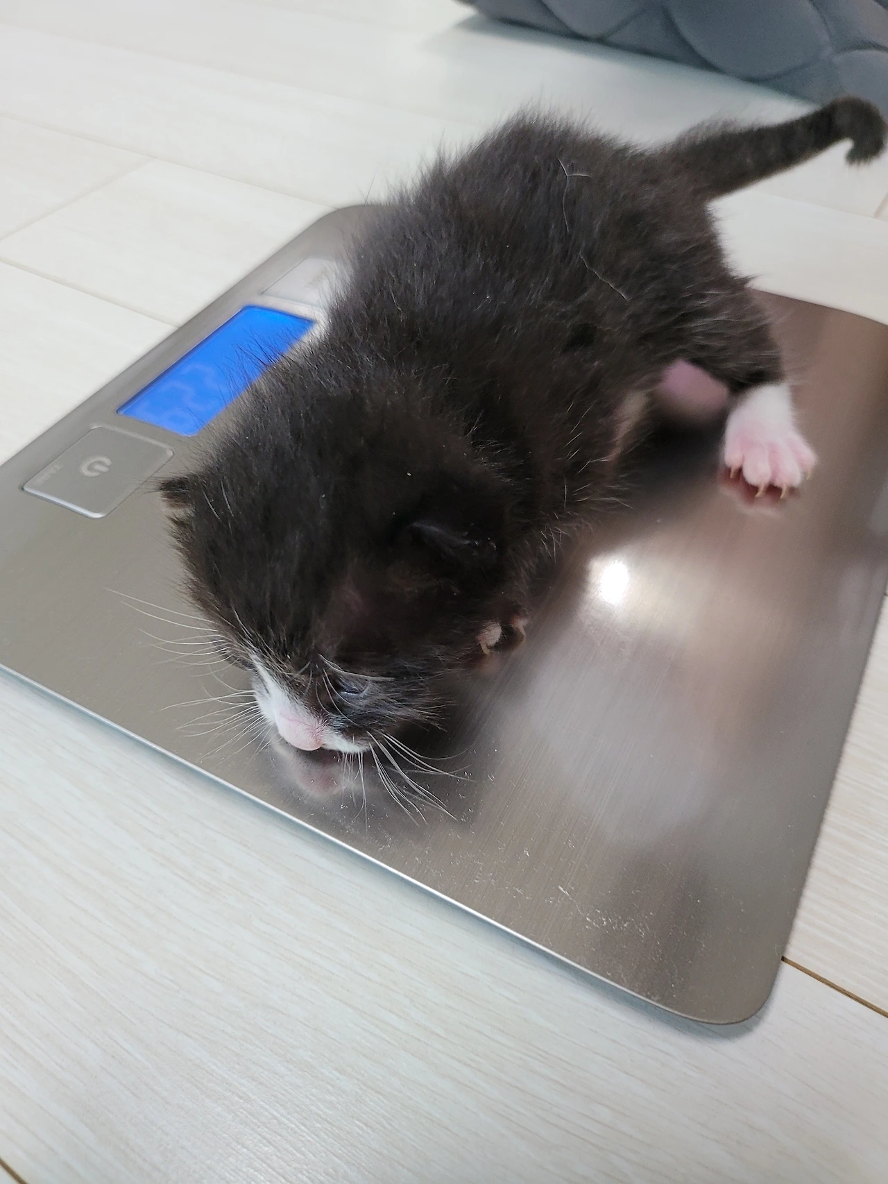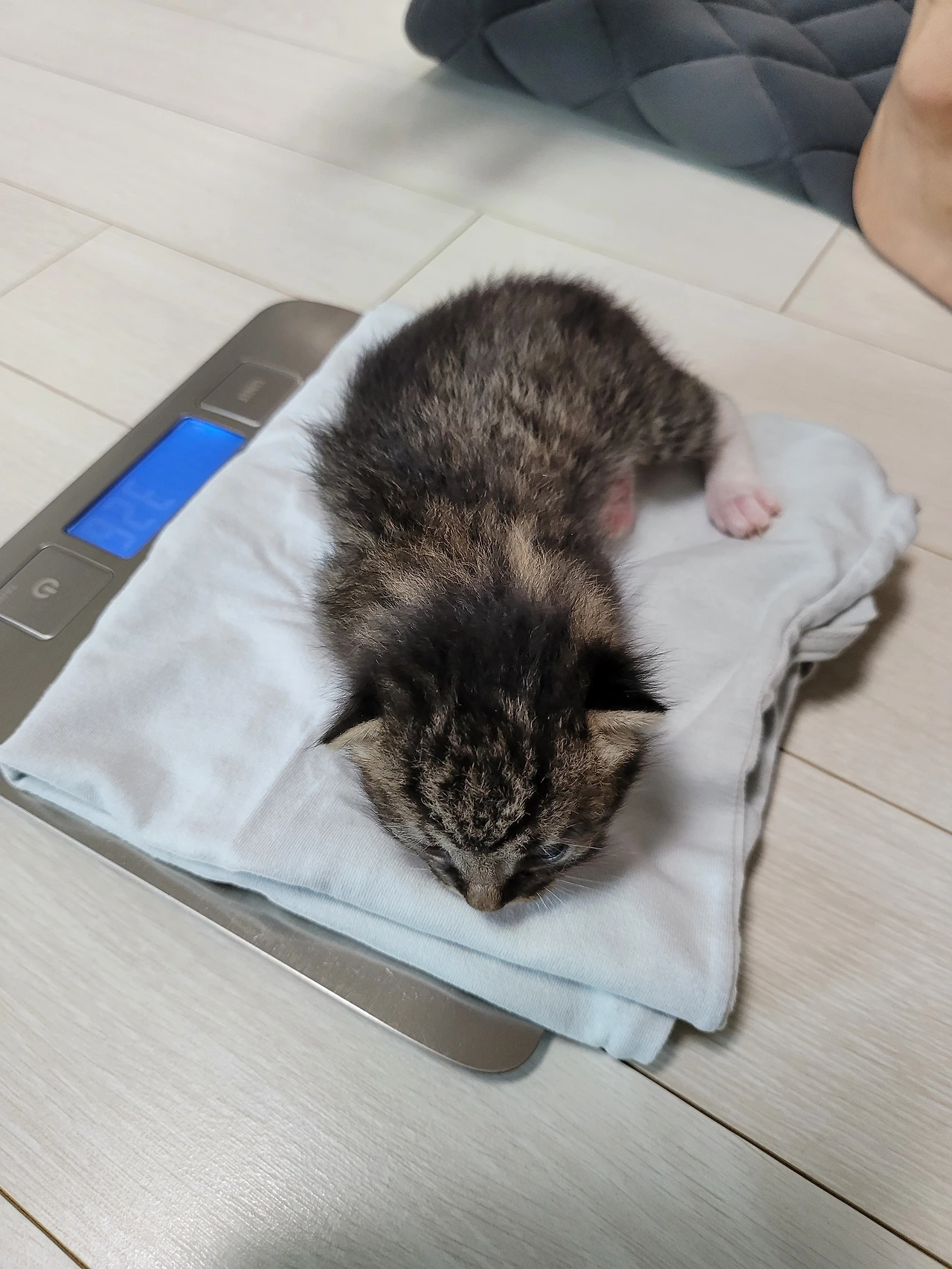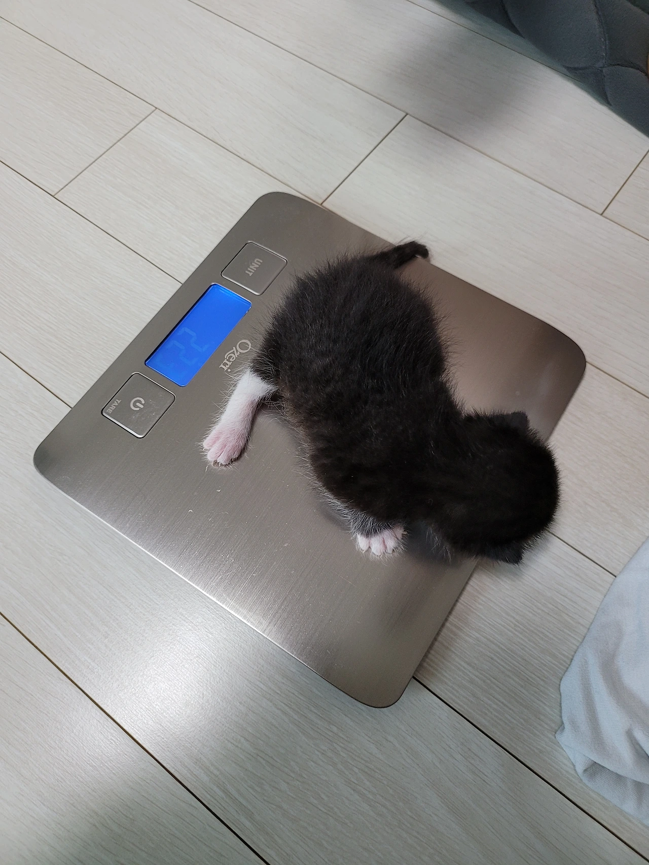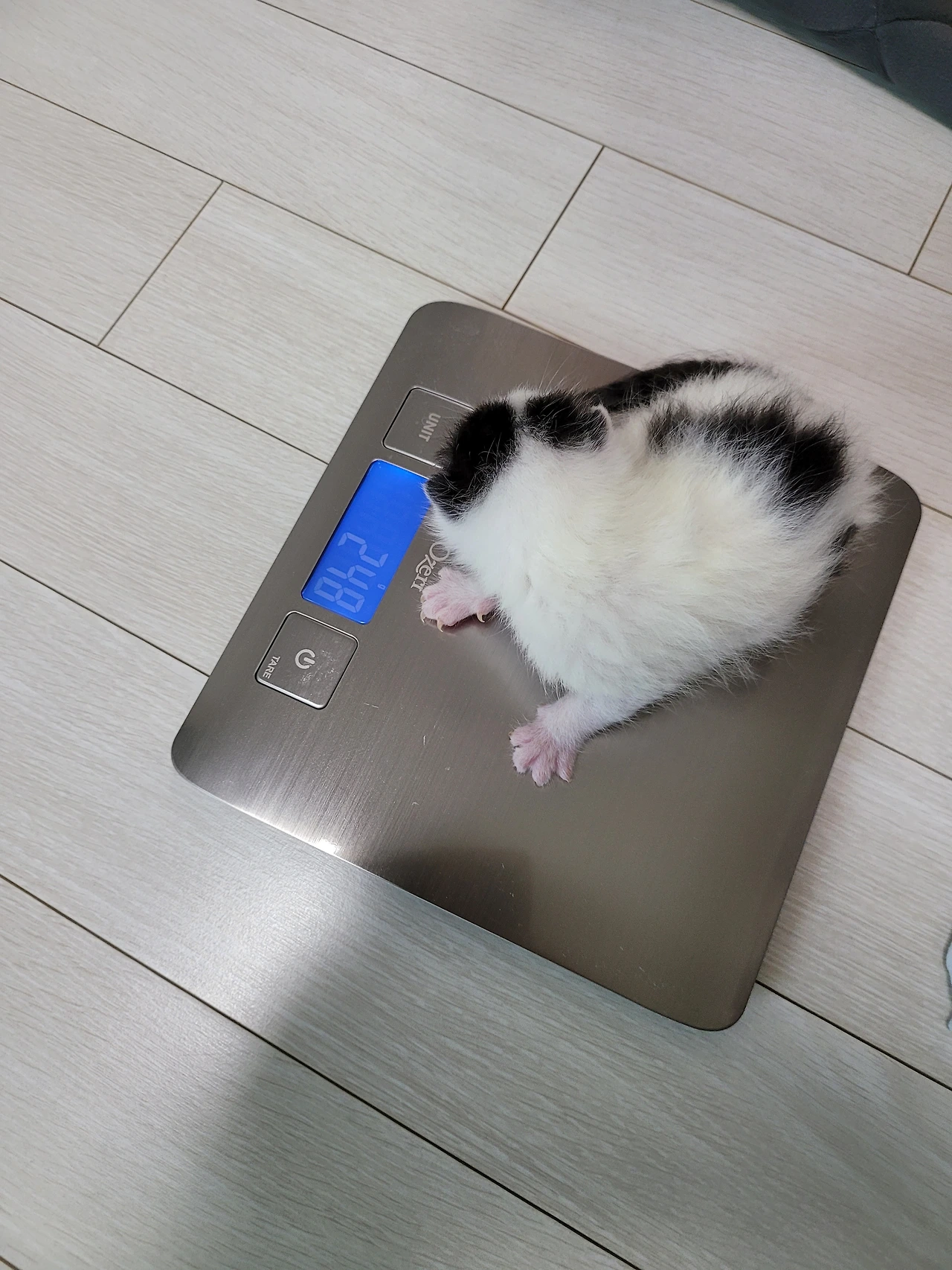부엌에서 쓰는 저울 위에 그냥 올려두었다가 자꾸만 내려오는 탓에 정확하게 재는 것이 어려웠다. 그 뒤로는 작은 플라스틱 그릇 안에 냥이를 넣어 재는 방법을 썼다. 이 방법이 훨씬 수월했지만, 그 안에서도 나가려고 바둥거리는 녀석들. 작은 그릇의 높이도 넘어가지 못하고 침울해하는 모습이 그저 귀여울 뿐이었다.