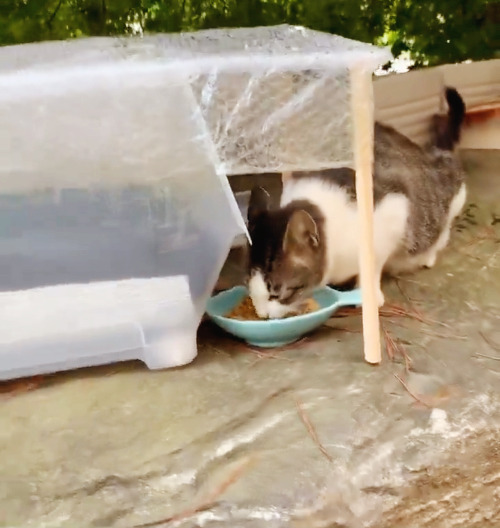 미친 듯이 장대비가 내리던 밤이었다. 엄청난 양의 물이 하늘에서 쉼 없이 쏟아졌고, 멈출 기미가 보이지 않았다. 혹여나 '이 날씨에 새끼를 낳지는 않을까, 혹여 잘 못 되지는 않을까' 하는 걱정이 커져만 갔다. 남편과 함께 집에 있던 반투명한 플라스틱 박스로 부랴부랴 집을 만들어 식당 앞으로 가져갔다. 다행히도 미덕이는 굳게 닫힌 식당입구 처마밑에서 비를 겨우 피하고 있었다. 그 모습이 어찌나 딱하던지...... 우리를 보자 '냥냥~' 거리며 다가와 사료와 간식을 먹고, '냥~냥~' 인사하듯 소리를 내었다.