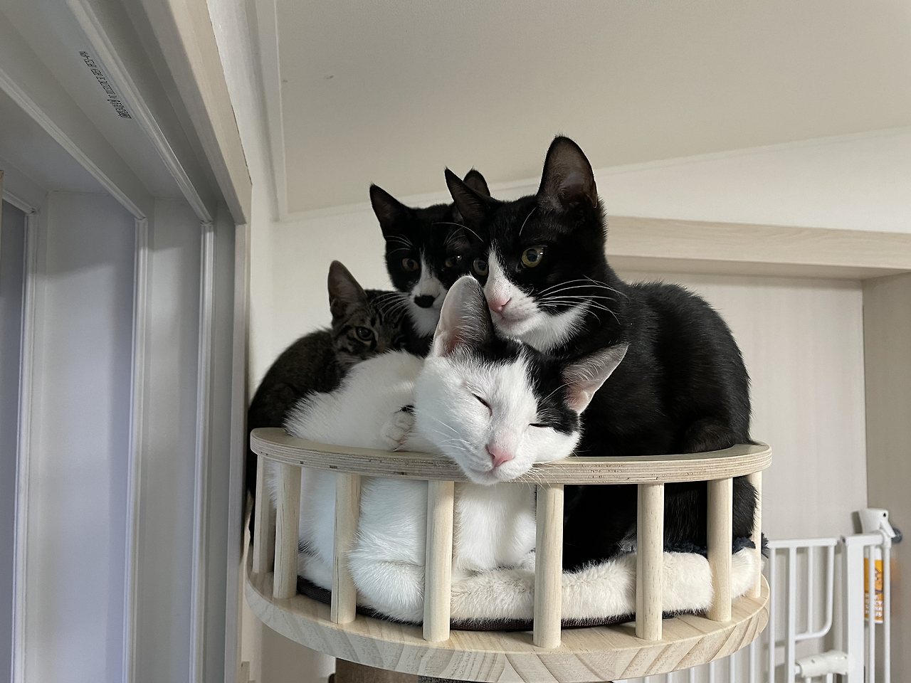미덕이, 토리, 몽돌, 코코, 코난 ‘미토몽코코’ 다섯 마리 고양이와 두 집사가 조용하고 온기가 감도는 공간을 공유하며 서로의 삶 속에 깊이 스며들었다. 오롯이 부부의 공간이었던 우리 집 이곳저곳에 그저 귀엽기만 한 고양이가 다섯 마리나 있다니. 모두 다른 성향과 외모덕에 질릴 틈도 없이 우리를 홀리기에 바쁜 고양이들이다. 이제는 미덕이보다 덩치가 커지고 청년이 된 사형제 ’몽토코코‘가 미덕이와 함께 ‘우리의 집’에서 서로를 의지하며 살아가는 지금이 행복하기를 바란다.