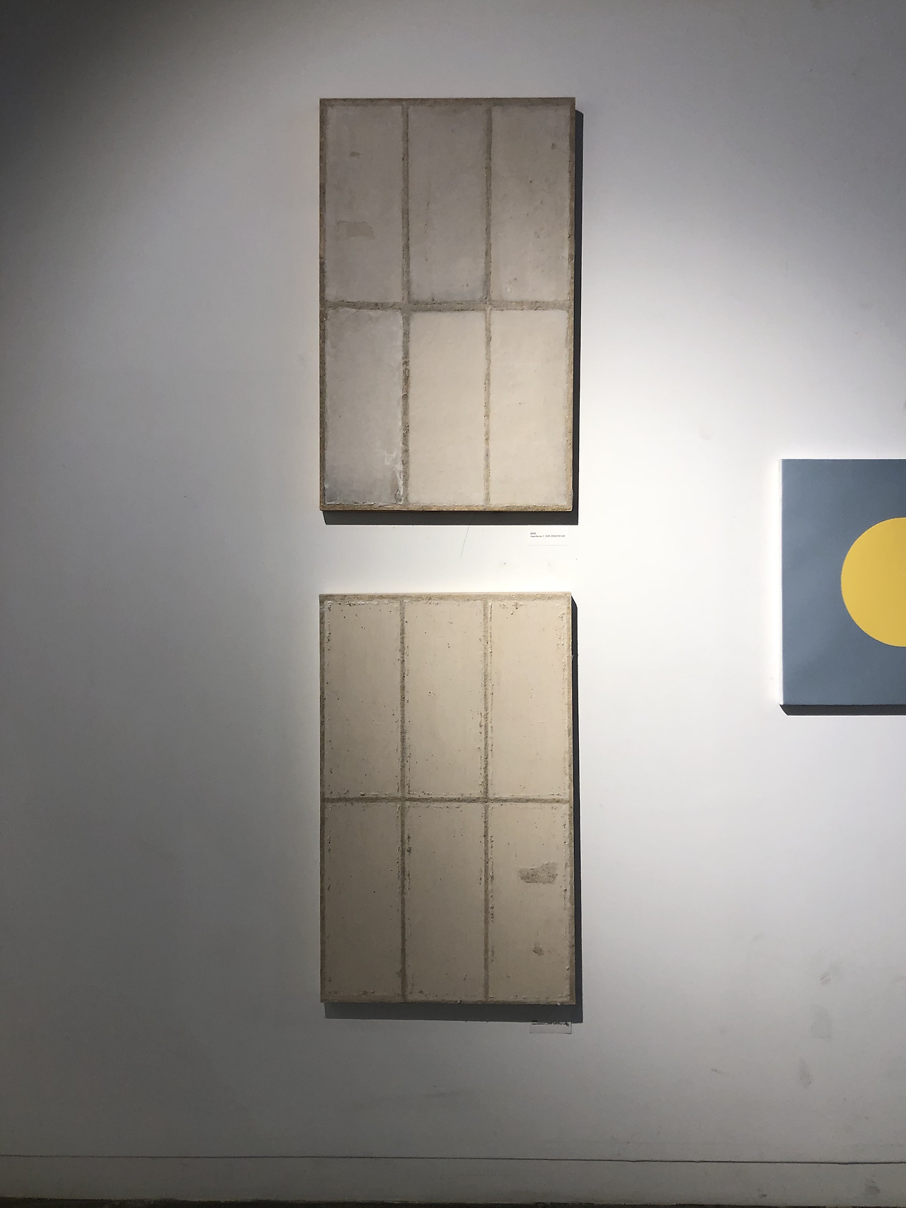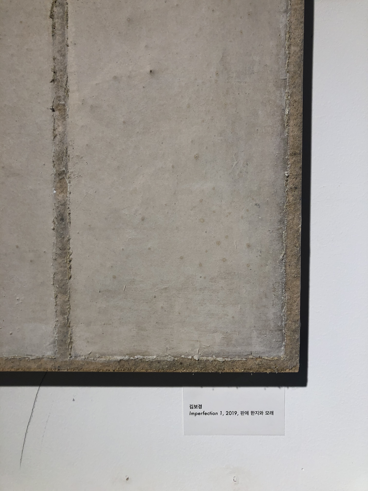 전시되어있던 Imperfection 시리즈의 첫인상은 거침없음이었다. 멀리서 보아도 가까이서 보아도 재료적 물성에 의해서도 가장 먼저 느껴지는 거침없음을 보고 있노라니 호기심과 어딘가 모를 불편함, 그리고 아이러니하게 친근함이 느껴졌다. 판 위에 한지와 모래라는 재료가 섞여있는 모습은 마치 imperfection 하면서도 발걸음을 멈추게 하는 신비로움이 담겨있었다. 평소 알고 있던 곡이 변주를 통해 새로이 들리는 것처럼 머릿속에 있던 재료의 물성에 변주를 준 작업처럼 보였다.