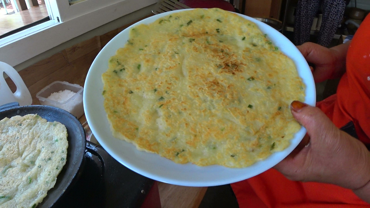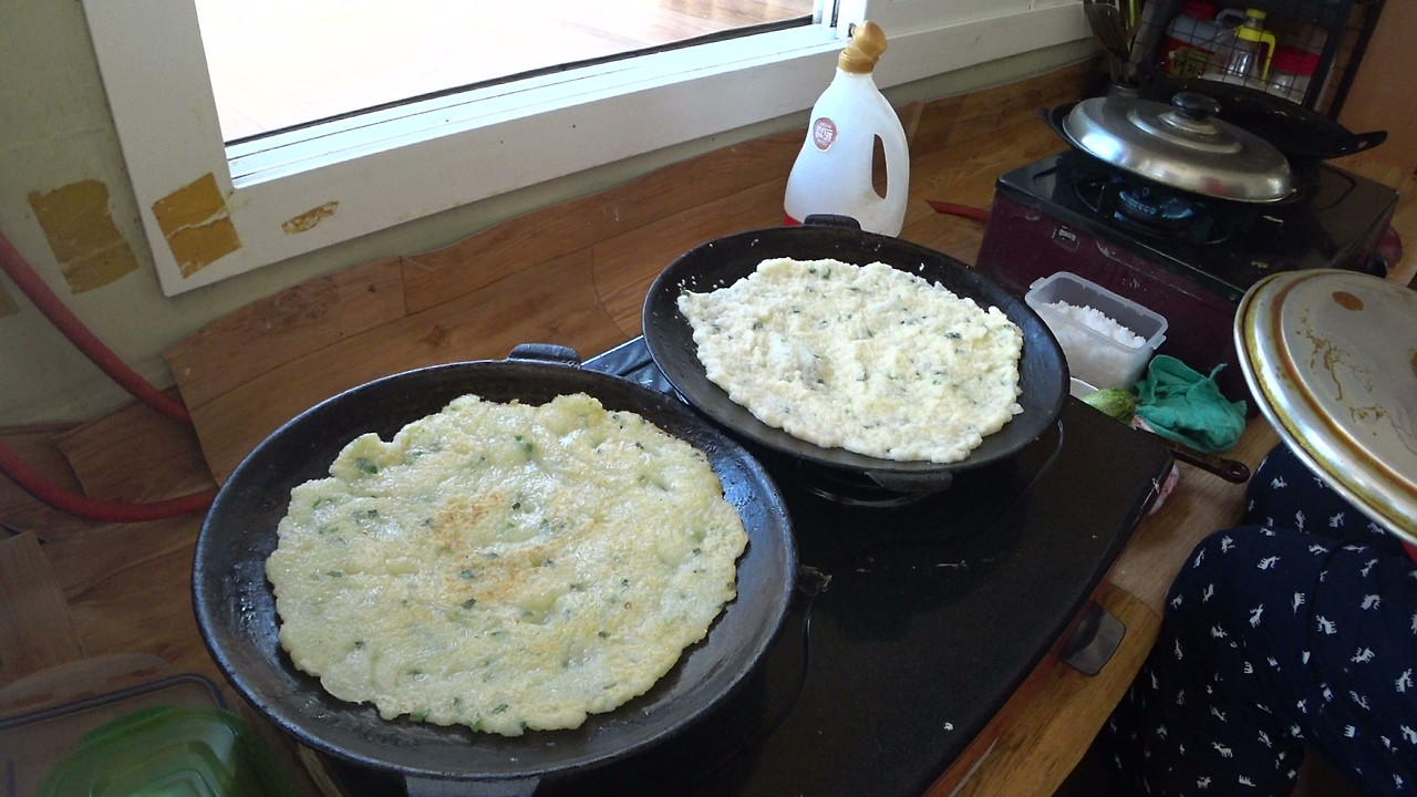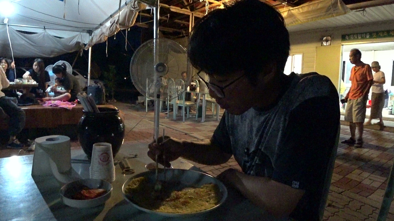 내 앞에는 감자전과 잔치국수가 올라왔다. 대부분의 재료가 마을 근방에서 나온 것이니 맛이 없을 수 가 없다. 후루룩 들이키는 국수는 진한 육수에 쫄깃한 면발이 인상적이었고, 쫄깃한 감자전은 식감이 예술이었다. 맛을 보니 왜 유명해졌는지 알 것 같았다. 이 맛에 이 가격이면 누구라도 올 것이다. 정신없이 먹고나니 다시 주변이 보였다. 저녁 늦게까지 이어진 장터는 정말 바빠보였다. 밥도 얻어 먹었겠다, 나도 감자 깎는 일을 도와드리기로했다. 주방에서는 어머님 세분이 분주하게 감자를 깎고 계셨다.