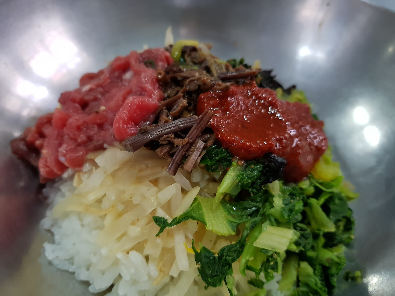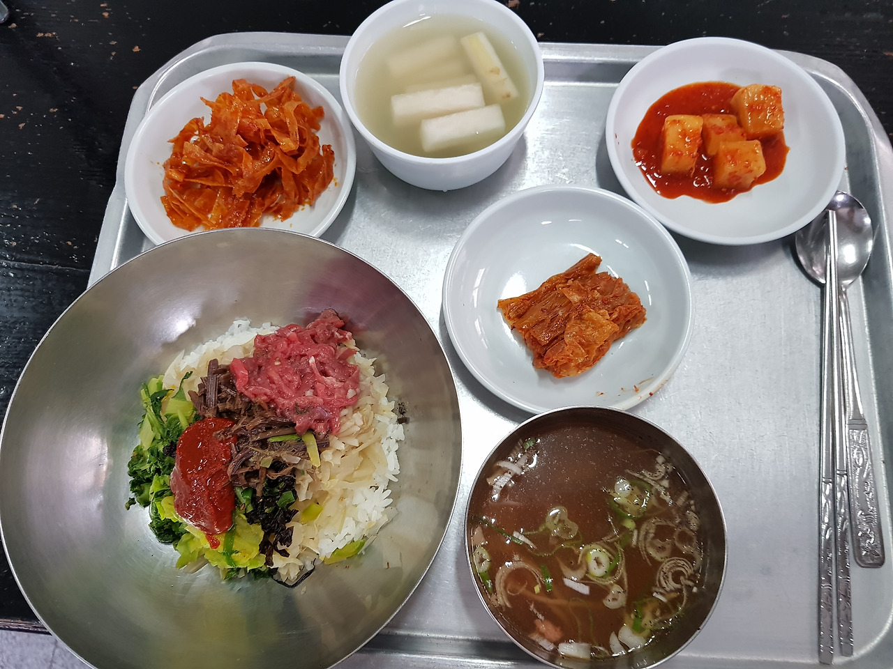 잠시 후, 스테인리스 쟁반에 비빔밥과 반찬 그리고 선짓국이 함께 나왔다.
