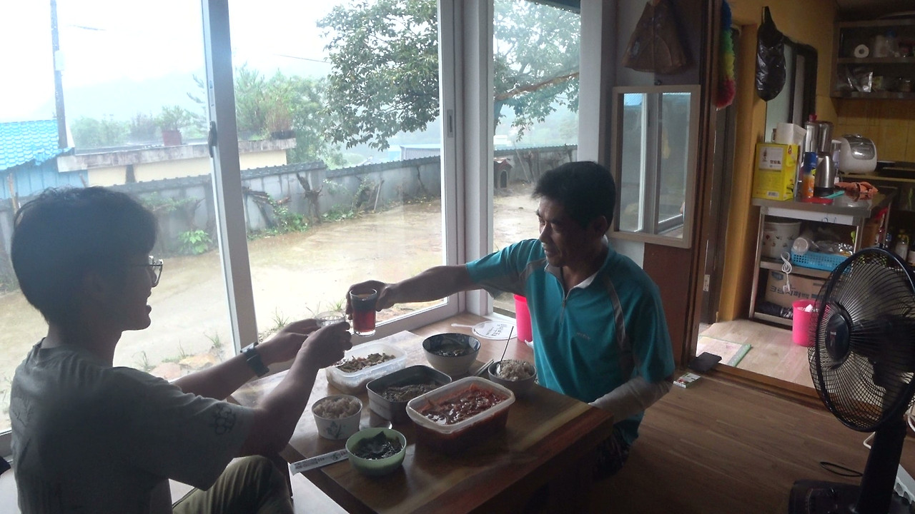 밖에서 이야기를 하다보니 빗방울이 굵어지기 시작했다. 집안으로 들어온 아버님은 나에게 점심을 준비해주셨다. 이날의 메뉴는 들깨 미역국과 죽순장조림, 고구마순김치 그리고 아버님이 직접 담그신 칡술.