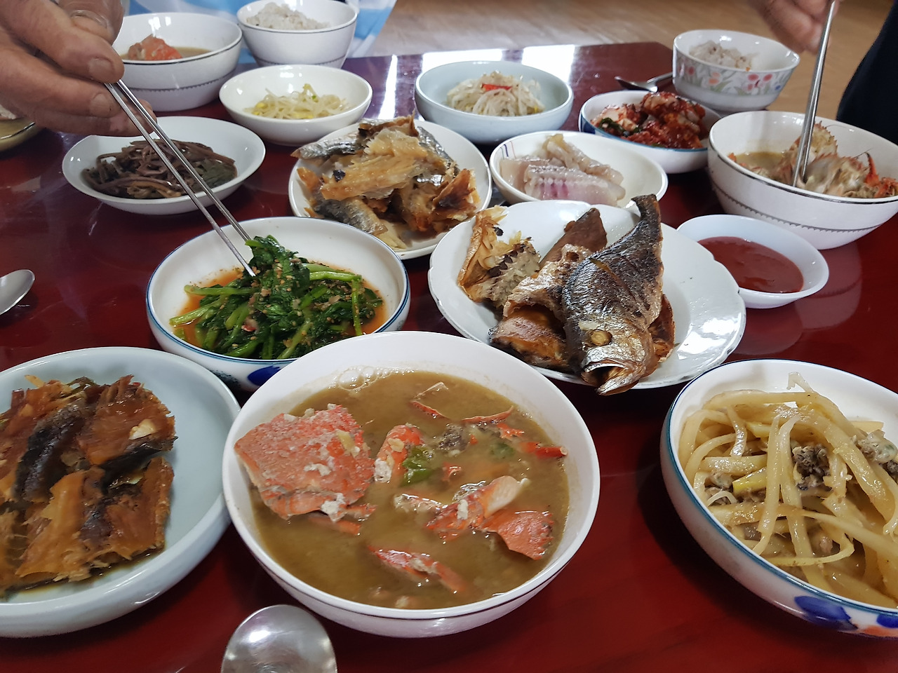 이날 저녁, 연휴 전날이라 가족 중 나만 시골에 내려왔기에 간단하게 밥을 먹고 싶었지만, 할머니와 할아버지의 마음은 그게 아니었나 보다. 내가 가장 좋아하는 생선구이를 포함해 코다리 조림, 양념게장, 홍어, 전복, 게 찌개, 각종 나물 반찬 등 모든 반찬이 총출동했다.