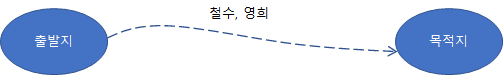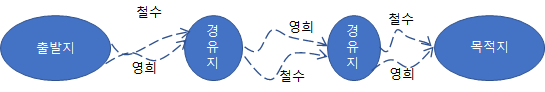 길을 알려 주는 또 다른 방식도 있다. 중간 경유지들을 활용해서 알려주는 방식이다. 이 방식은 목적지가 멀고, 그리고 경유지에서 다음 경유지로 가는데 활용할 수 있는 이동 수단이 다양한 경우에 적합하다. 이 안내 방식을 그림으로 그려보면 다음과 같다.