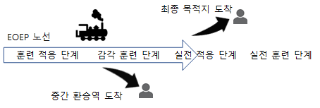 이곳에서 말하는 '훈련 전환 개념'은 훈련자 각자의 성향과 기호를 반영할 수 있는 큰 차원의 옵션에 해당한다. 'EOEP 훈련 진행 체계'가 '열차 노선'이고 훈련자들은 'EOEP 열차'라는 가상의 열차를 타고 그 노선을 따라가고 있다고 상상해 보자.