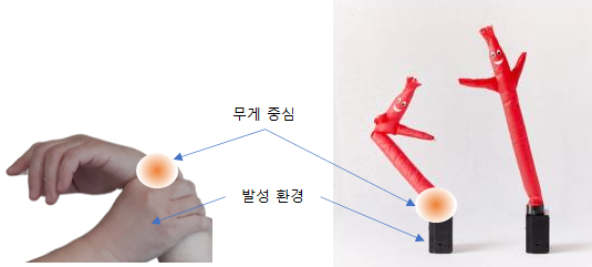 '발성의 무게 중심'이라는 것은 이론적으로 말하면 '발성 좌표계의 원점'에 해당하지만, 좀 더 쉽게 이해할 수 있게 말하자면 스포츠에서 말하는 '무게 중심'이라는 것을 떠올리면 된다. 근육을 사용하는 모든 스포츠 종목에는 '무게 중심'이라는 것이 있다. 만약, 스포츠에 대한 경험이 없다면 다음 그림처럼 손목이나 또는 길거리 행사에서 사용하는 바람 풍선을 상상해 봐도 좋다.