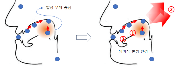무게 중심을 이동시키는 ①, ② 작업을 동시에 우선적으로 해야 하는 작업이다. 이것이 잘 되면, 전체 근육을 완화시키는 ③ 작업은 상대적으로 편하게 될 수 있다. 이 3가지 작업이 정상적으로 되면 결과적으로 영어식 발성 환경이 구성되게 된다.