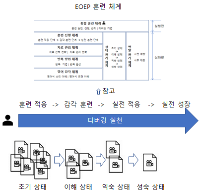 영어 훈련은 결국 영어의 '반복 활동'과 그리고 필요한 것을 배우고 이해하는 '공부 활동'으로 이뤄진다. 그런 활동을 통해서 발성, 발음, 리듬 그리고 어순, 어휘, 문법, 사고 방식을 익혀간다. 그리고 각각의 훈련은 그 수준에 따라서 '텍스트 차원, 감각 차원, 실전 차원'의 훈련으로 구분될 수 있다. 하지만, 이 모든 훈련은 결국 '이해가 되지 않는 문제', '익숙하지 않은 문제'를 찾아서 그것을 이해하고 익숙해지는 활동으로 이뤄진다. 이렇게 문제를 해결해 나가는 과정을 체계화해 놓은 것이 EOEP의 디버깅(debugging)이다. 디버깅은 '영어 훈련과 훈련 도구' 편에서 이야기되고 있다. 이곳에서는 '표현 훈련'을 이해하는데 필요한 정도에서 소개한다.