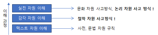 왼쪽 그림은 이해 과정을 간단히 그리고 있고, 오른쪽은 그것을 좀 더 구체적으로 그리고 있다. 그림에서는 각각의 이해 단계를 '텍스트 차원 이해', '감각 차원 이해', '실전 차원 이해'이라고 부르고 있다.