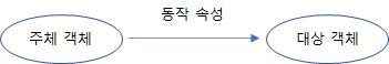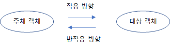 이 또한 객체의 기본 특성이다. 인간이라는 객체는 '말을 할 수 있고 들을 수 있는' 동작 속성이 있다. 이런 속성을 통해서 서로 영향을 주고받게 된다(interaction). 이때 영향을 가하는 객체와 영향을 받는 객체를 특별히 '주체 객체', '대상 객체'라고 부를 수 있다. 이런 상호 작용개념을 그림으로 그리면 다음과 같다.