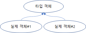 앞에서 '호랑이라는 유형의 동물'과 '실제로 존재하는 호랑이 객체'를 구분하는 사고방식을 가지고 있다고 했었다. 이것을 객체 지향에서는 '타입 객체'와 '실제 객체'라고 부른다. 즉, '호랑이라는 개념'자체는 객체 지향의 '타입 객체'이다. 반면에 '실제 호랑이'는 '실체 객체'에 해당한다. 이 관계를 다음과 같은 그림으로 나타낼 수 있다.