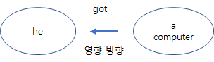 객체 지향식으로 해석하면 '주체 he가 대상 객체인 컴퓨터에 영향을 미쳐서 그 결과로써 그것이 자신의 방향으로 왔다'는 의미이다. 이때의 get은 상황 맥락에 따라서 '주체가 돈을 주고 구매하다' 또는 '주체가 원해서 다른 사람으로부터 얻다'는 식의 의미로 이해할 될 수 있다. 다시 말하면, 이 경우의 get은 주체가 대상에 어떤 영향을 미친 결과로써 주체의 상태 변화(소유 상태)를 나타난다. '영향의 방향'을 그리면 다음과 같다.