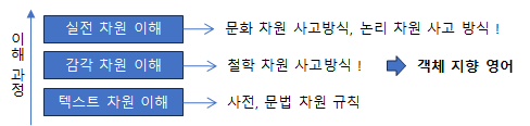 이제 영어 표현을 객체 지향적으로 이해한다는 것이 무엇인지를 알아본다. 훈련자들이 이런 개념들에 익숙해질수록 문법과 사전을 중심으로 하는 생각하는 수준에서 영어식 사고방식을 중심으로 생각하는 수준으로 효과적, 효율적으로 올라갈 수 있게 된다. 참고로, 지금 하고 있는 이야기들이 어디에 해당하는지를 다시 상기하자.