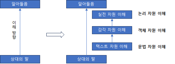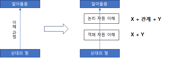 정상적이라면 왼쪽 그림처럼 되어야 한다. 즉, 상대의 말을 들으면서 생각과 감정을 실시간 정방향으로 이해하는 것이 되어야 한다. 그런데 이것이 잘 되지 않는다는 것은 그 중간 과정에서 문제가 있다는 의미가 된다. 이곳에서는 이 중에서 '객체 차원 이해'와 '논리 차원 이해'를 어순 관점에서 살펴보면서, 어순을 익히는데 필요한 개념을 알아보도록 한다.