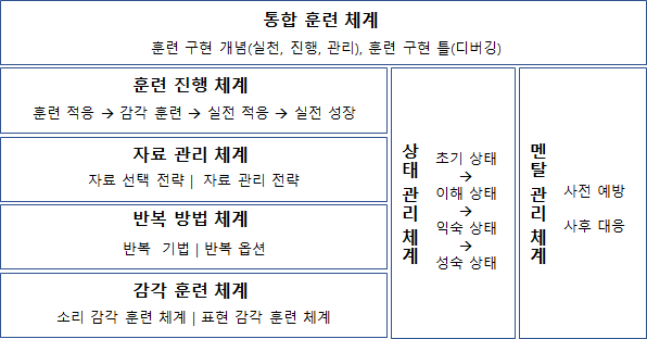 요컨대, '성공적인 훈련 방법'이라는 것이 나와야 한다면, 앞에서 말한 구성 요소와 구성 작업들을 모두 고려하는 통합적인 차원의 방법이 나와야 한다. 여기에는 훈련자가 '선수 역할'과 '관리 감독 역할'을 수행하는데 필요한 개념들과 방법들이 모두 체계화되어 있어야 한다. 결국, '성공 차원의 방법'이라는 것이 있어야 한다면 그것은 '체계와 시스템'의 형태로 나올 수밖에 없다는 것이다.