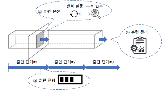 '영어 훈련, 영어 연습이라는 것이 무엇인가'라는 말을 들으면 이 그림을 떠올리는 것이 현실적이고 합리적이라고 할 수 있다. 즉, 영어 훈련이라는 것은 '훈련자'가 '영어 자료'를 선택하고, 그것을 적절한 '반복 방법'으로 반복해 나가면서 '실천, 진행, 관리 작업'을 수행해 나가는 것을 말한다.