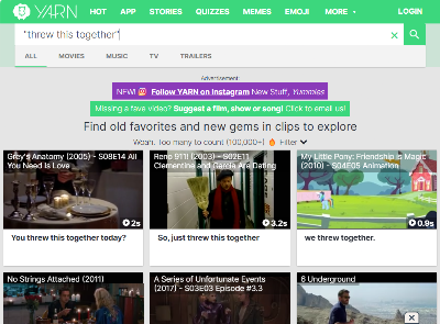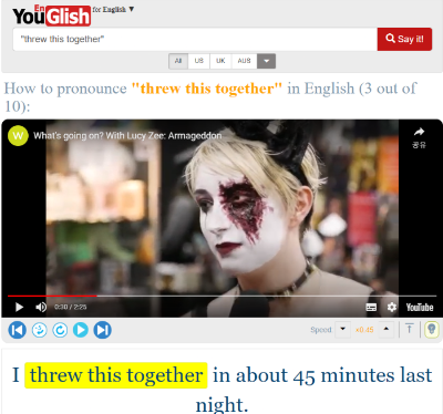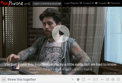 예를 들어서, youglish.com을 통해서 'threw this together'라는 테스트를 검색해 봤다고 하자.