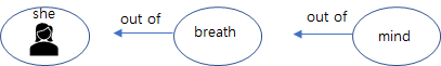 영어 표현을 그림처럼 she, breath와 mind 단위로 생각하고 있다는 것 자체가 그것들을 '객체'로 인식하고 있다는 의미이다. 그리고 이런 그림을 보면서 '그녀가 breath, mind 영역에서 빠져나와서 'out of' 한 상태에 있다'는 식으로 이해할 수 있다. 그런 다음 그 상태를 '숨이 가쁜 상태, 제정신이 아닌 상태'와 연결해서 이해할 수 있다. 이것이 '객체 중심의 이해 방식'이다.