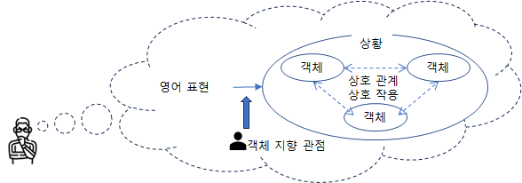 '객체 중심'으로 생각하는 이런 방식은 사실 영어 표현, 프로그램 코드만이 아니라 일상에서도 늘 사용하는 방식이다. 예를 들어, 어떤 이슈가 발생했을 때 그 상황을 파악하기 위해서 관련된 것들을 가리키면서 '이 녀석, 저 녀석'으로 부르게 경우가 많다. 이것이 '객체 지향 사고'이다. 원어민들은 그들이 태어나면서부터 접해 온 철학 방식 때문에 그들의 감각 세계에서는 이런 '객체 중심의 사고'가 무의식적으로 작동하고 있다고 말할 수 있다