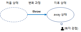 주체 I가 throw라는 동작을 통해서 대상에게 영향을 미쳤고 그 결과 상태로 away가 되었다