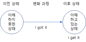 그림에서는 '변화 과정'이 '동작' 부분을 나타낸다. '이후 상태'가 '현재 상태'에 해당한다. '현재 상태'를 기준으로 해서 봤을 때 '변화 과정'은 과거의 일이고 그리고 I got it에서는 과거형이 사용된다. 그리고 현재의 상태를 나타내는 I get it은 현재형을 사용하게 된다.