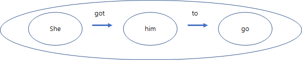 'she는 got을 통해서 him에게 영향을 미쳤고 got의 영향을 받은 him은 go에 도달하게(to) 되었다'