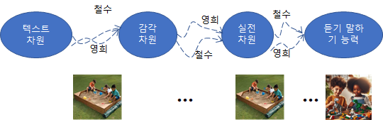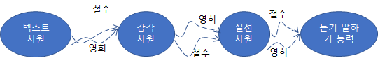 각자의 훈련 경로는 다를 수 있지만 영어 능력이 성장하기 위해서는 모두가 경유해야 하는 중간 경유지를 지정하는 것은 가능하다. 이런 능력 성장 과정상의 경유지를 기준으로 해서 단계적인 훈련 체계를 설계할 수 있다. 보통, '텍스트 차원, 감각 차원, 실전 차원'으로 구분해 볼 수 있다. 그렇게 되면 다음처럼 그려 볼 수 있다.