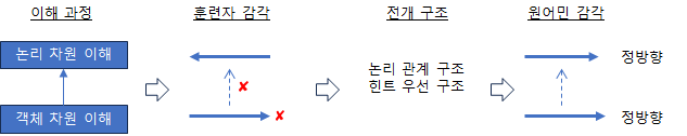 정상적인 경우라면 가장 왼쪽 그림처럼 작동되어야 한다. 그러나 어순이 다른 모국어를 사용하는 훈련자는 그다음 그림에서 보이는 것처럼 두 가지 유형의 방향성 문제를 경험하게 될 수 있다. 훈련자들은 이때 '힌트 우선 구조', '논리 관계 구조' 개념을 활용해서 원어민이 느끼는 정방향이 무엇 일지를 느끼기 위해서 노력할 수 있다.