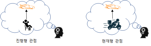 동일한 상황을 ‘진행형 관점’에서 볼 수도 있고 ‘현재형 관점’에서 볼 수도 있다. ‘진행형 관점’이라는 것은 화자가 보이는 모습 그대로를 묘사하는 관점을 말한다. 이런 경우는 표현도 진행형으로 나오게 된다.